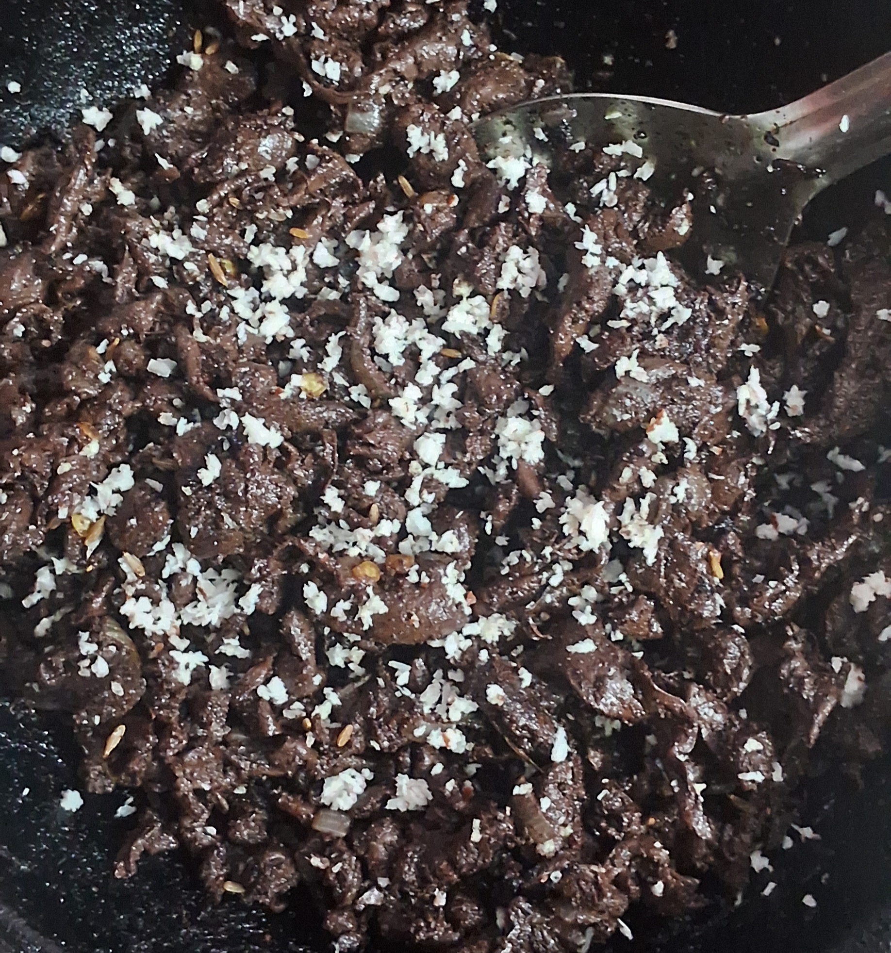 ரத்தம் நன்கு பொரியலாக வந்ததும், நறுக்கிய கொத்தமல்லி இலை தூவி இறக்கலாம். தேங்காய் துருவியதை இறக்கிய பின் தூவவும்.